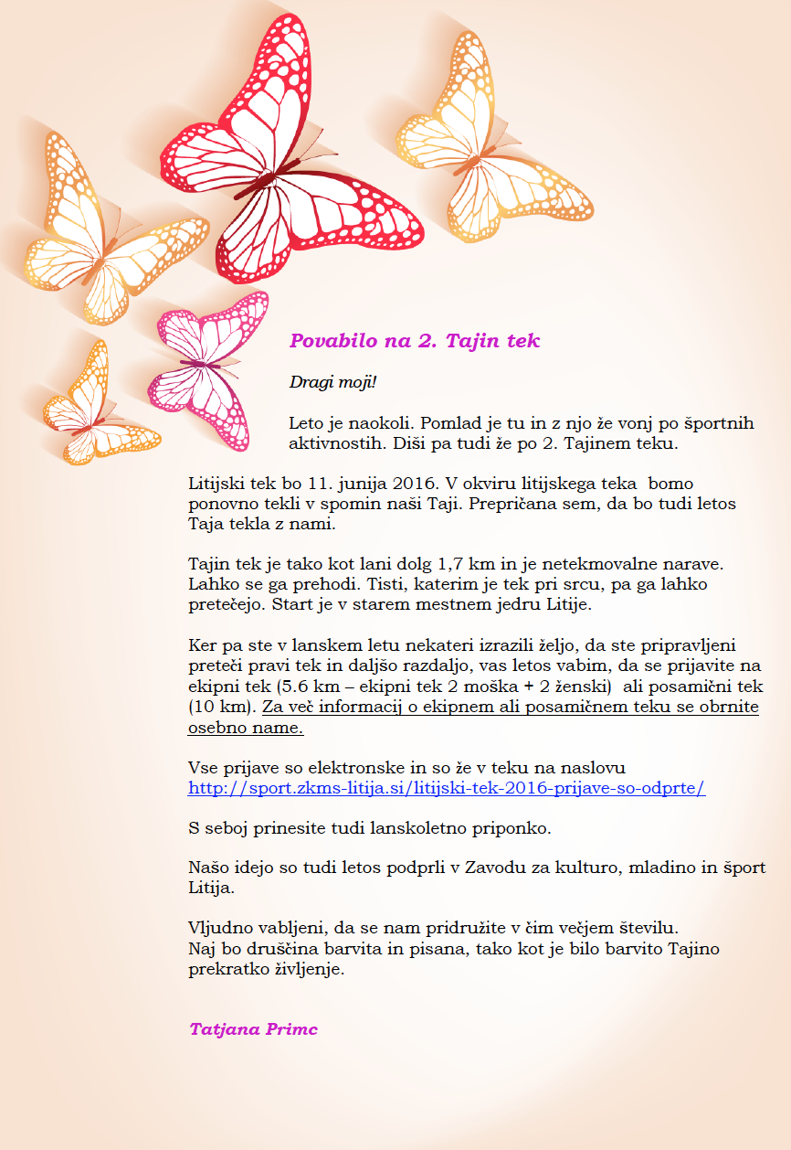 Litijski tek bo 11. junija 2016. V okviru litijskega teka bomo ponovno tekli v spomin naši Taji. Prepričana sem, da bo tudi letos Taja tekla z nami.