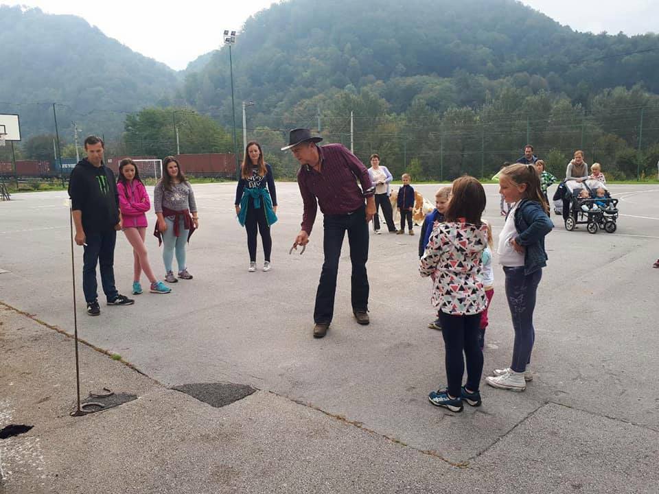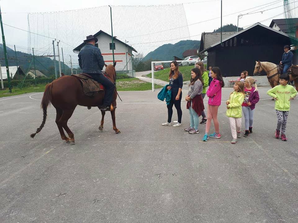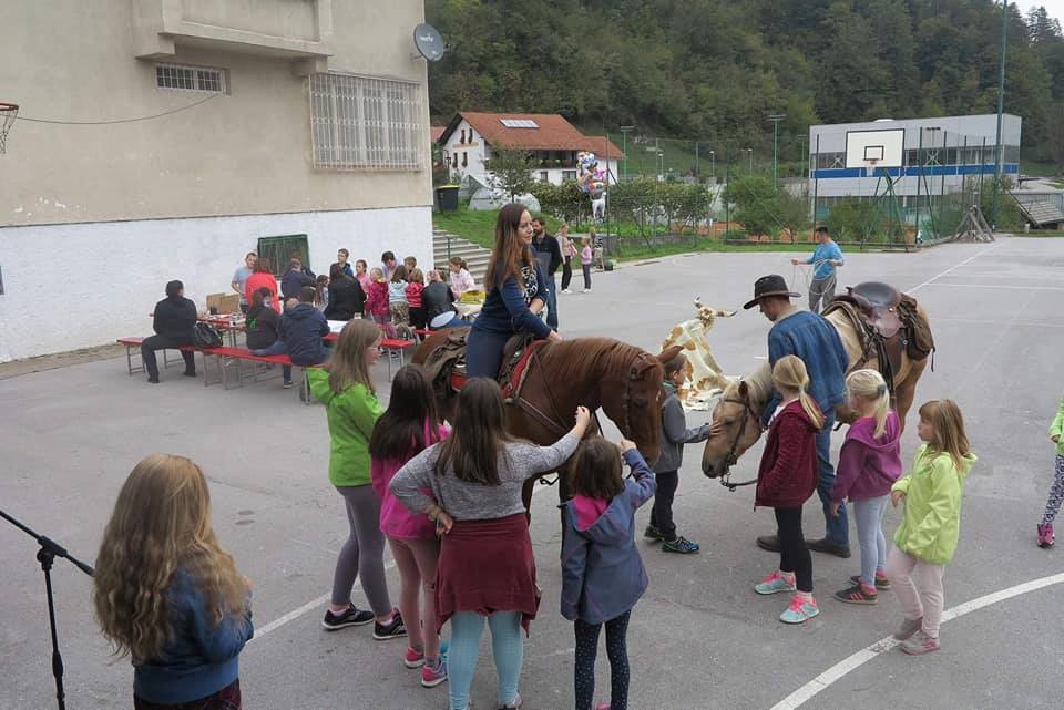 V nedeljo se je že zgodaj na asfaltnem igrišču slišal otroški živ žav in konjski rezget. V okviru delavnic za otroke, ki jih organizirale Mateja Malis vodili Barbara Škrabanja, Alenka Karlin in Evgen Malis, sta že ob 9.30 prijahala člana Konjeniškega društva Litija Sandi Gombač in Damjan Samec s konjema Tik tak suprise in Rokita. G. Gombač je navdušene otroke poučil o ravnanju s konjem, najpogumnejši so ga lahko celo zajahali. Otroci so se pomerili v tipičnim kavbojskih disciplinah: metanju lasa in podkvic.